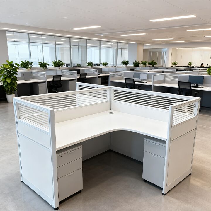 Moderne houten personeelsbureaus met glazen schermen voor kantoorwerkstations